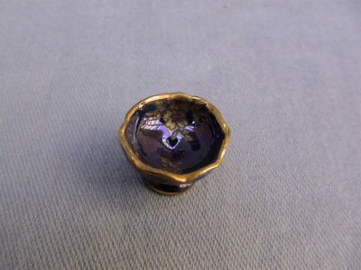 This is a 1/24th scale dolls house miniature, hand decorated in the UK, with a blue lustre, and a gold, "Provence" design. The rim is guilded with real gold.