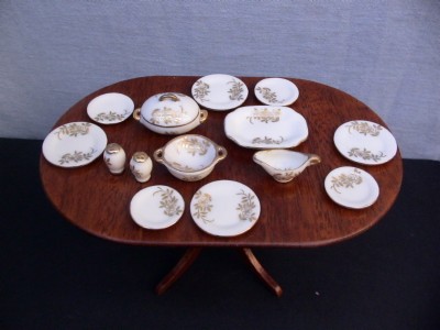4 dinner plates - 23mm diameter, 4 side plates - 19mm diameter, handled veg dish - 2.5cm x 1.8cm, lidded tureen - 2.8cm x 1.9cm, cruet set - 1cm tall, gravy jug - 2.3cm wide x 1cm tall, and a rectengle platter - 2.2cm x 3cm.