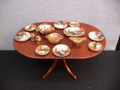 This is a 1/12th scale dolls house miniature, hand decorated in the UK, with an all-over "Hunt" design. It is guilded with real gold.
