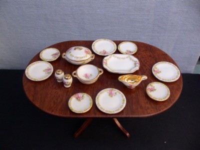 4 dinner plates - 23mm diameter, 4 side plates - 19mm diameter, handled veg dish - 2.5cm x 1.8cm, lidded tureen - 2.8cm x 1.9cm, cruet set - 1cm tall, gravy jug - 2.3cm wide x 1cm tall, and a rectengle platter - 2.2cm x 3cm.