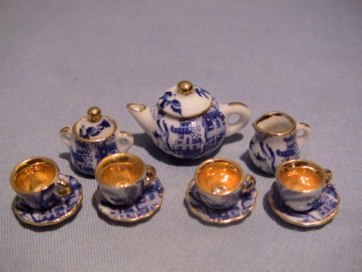 This is a 1/12th scale dolls house miniature, hand decorated in the UK, with a traditional Willow pattern design. It is guilded with real gold.
